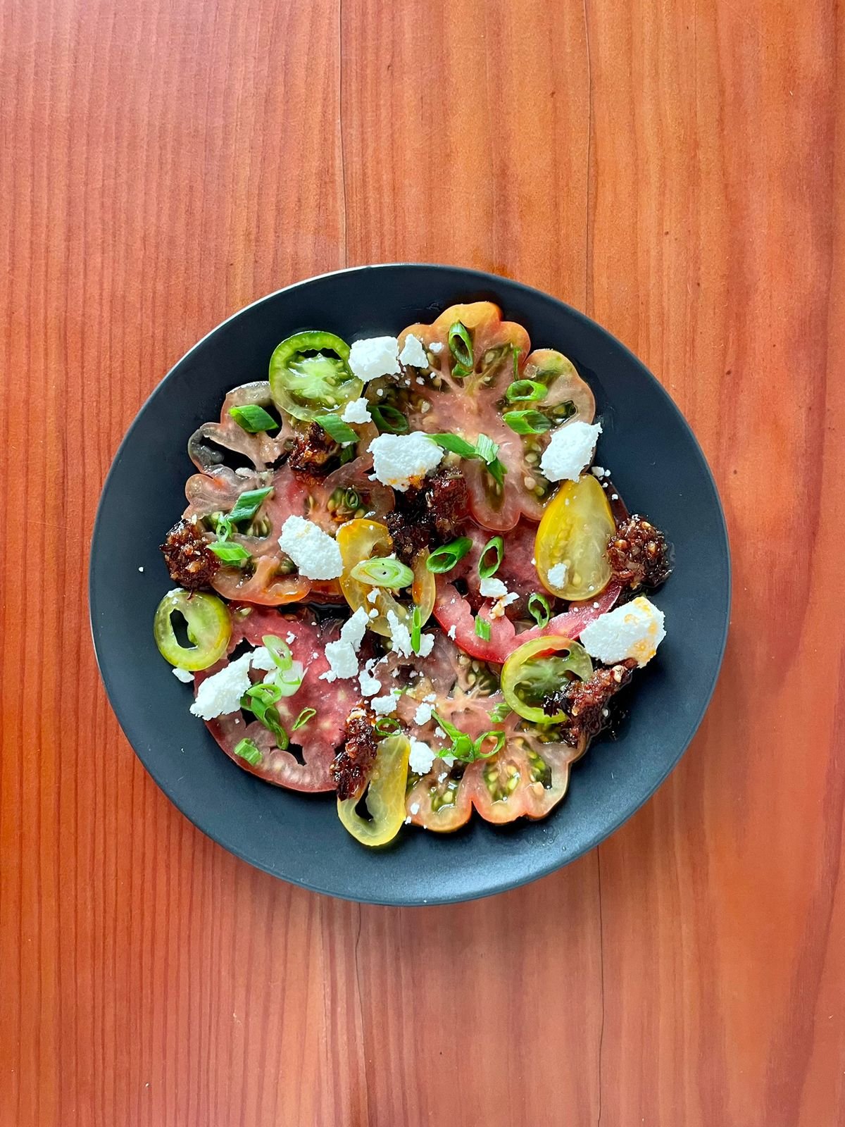 Tomato carpaccio, chillón, ají panca chili crisp, scallion, candied pecan // CORDIAL, Lima, Peru